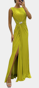 Une fusion impeccable de fluidité, d'élégance et de présence scénique. Shiloh se distingue par sa confection en tissu léger, son plissé méticuleux et sa fente latérale qui accompagne chaque mouvement avec grâce. Le décolleté croisé encadre délicatement la poitrine, tandis que la silhouette fluide allonge la figure avec subtilité et sophistication.