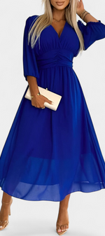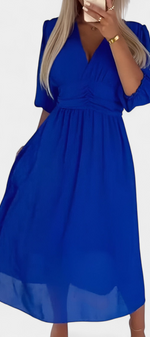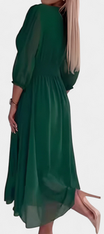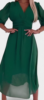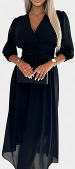 Élégance classique avec une touche raffinée et intemporelle. La robe Dorina combine une silhouette fluide avec un décolleté en V et des manches semi-transparentes qui mettent en valeur la silhouette avec douceur. Sa coupe midi et sa taille définie en font le choix idéal pour des célébrations avec style et confiance.