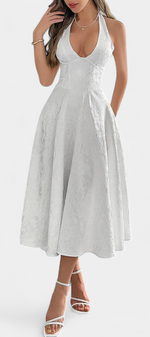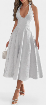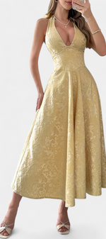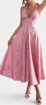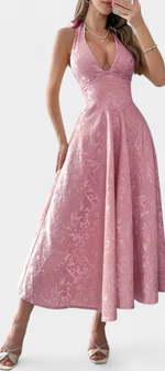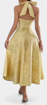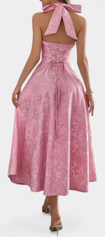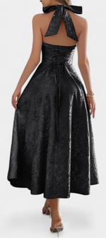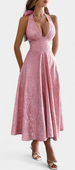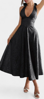 Sophistication avec attitude pour briller avec style à chaque occasion. La robe Gilda allie la texture luxueuse du jacquard à une silhouette féminine et des détails audacieux. Son décolleté profond et le dos nu avec un nœud ajustable mettent en valeur la silhouette avec élégance et caractère.