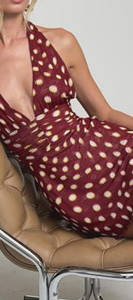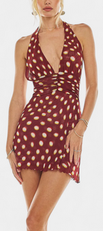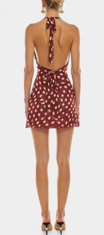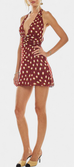 Charme rétro avec une silhouette qui épouse la figure avec fraîcheur et style. La robe Livia se distingue par son imprimé à pois clairs sur fond bordeaux et une coupe mini qui équilibre coquetterie et élégance. Son décolleté en V et son tissu élastique en font une option confortable et féminine pour toute occasion.