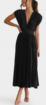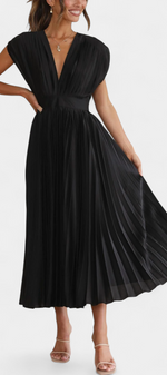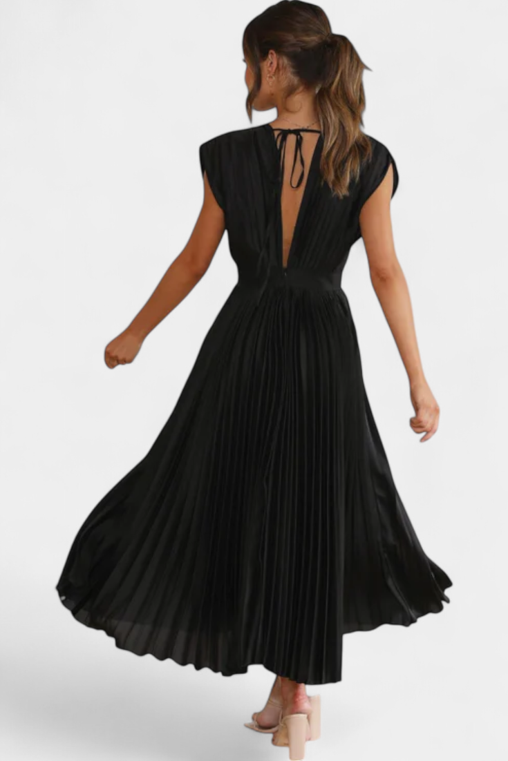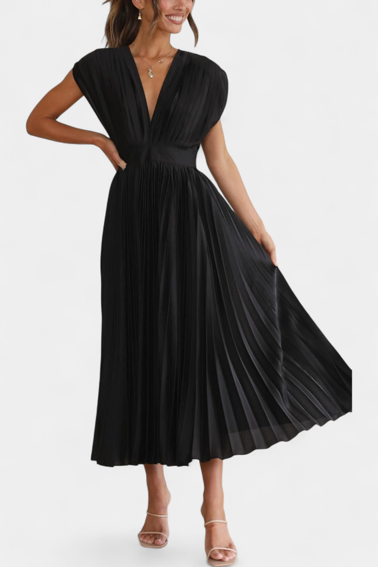 Élégance classique avec une touche moderne—la robe Mireia séduit par son décolleté en V drapé, sa taille haute et sa jupe fluide à plis qui se déplace avec grâce. Conçue pour offrir une coupe flatteuse et un confort léger, elle est parfaite pour toute occasion nécessitant un style sans effort.
