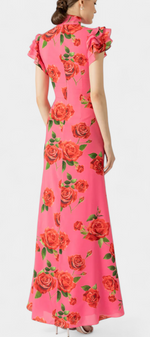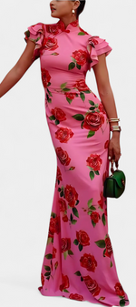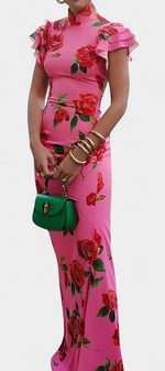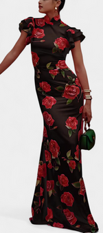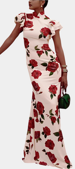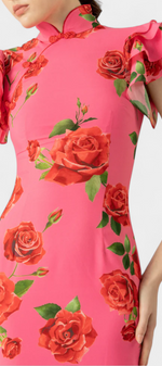 La robe Mayra réinterprète le style qipao avec une touche moderne et florale. Sa silhouette cintrée met en valeur la figure avec raffinement, tandis que le col mandarin classique et les manches volantées apportent caractère et sophistication. L'imprimé de roses ajoute un romantisme vibrant, équilibrant tradition et style contemporain avec naturel.
