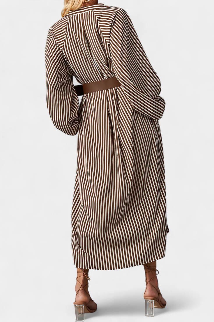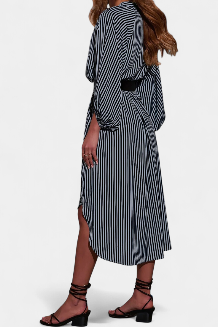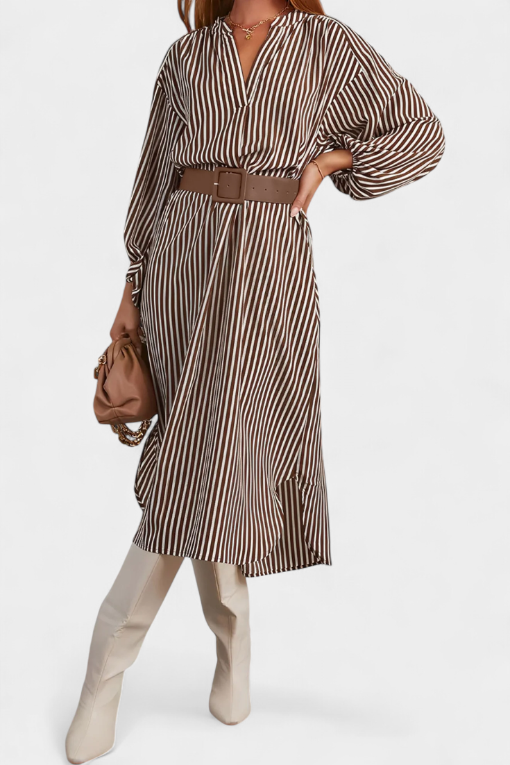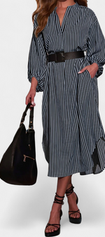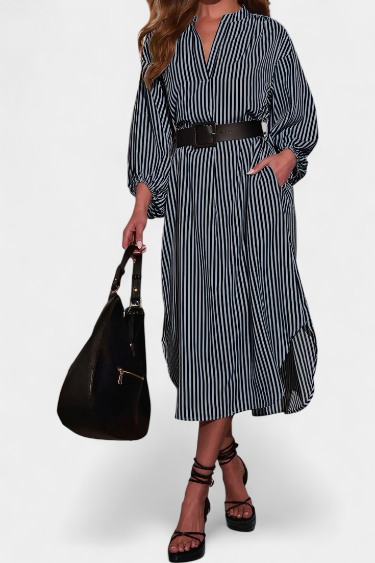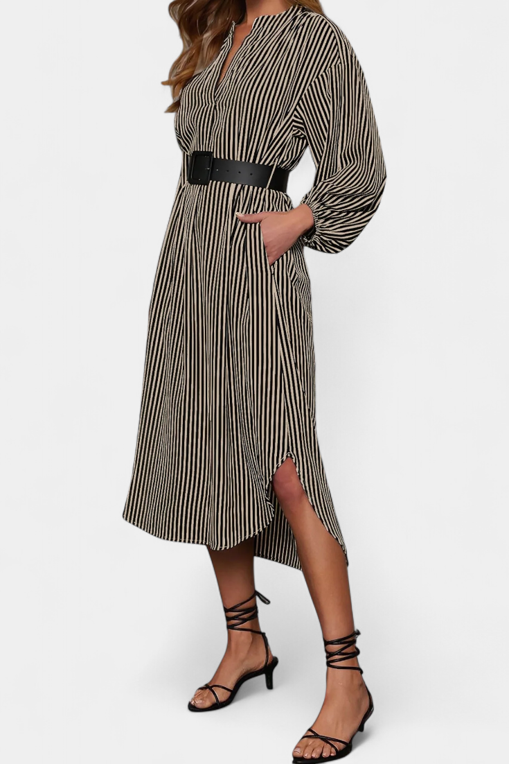 Une proposition moderne qui allie fonctionnalité et style raffiné. Eliana se distingue par un motif de rayures verticales qui affine la silhouette, un col en V qui apporte du caractère et des manches longues qui équilibrent le design. La ceinture ajustable définit la taille, tandis que les poches ajoutent une touche pratique et contemporaine.