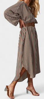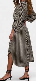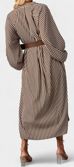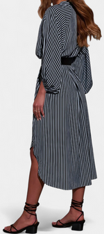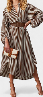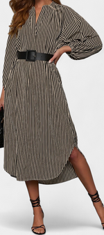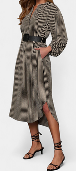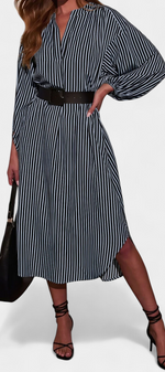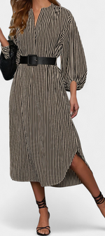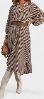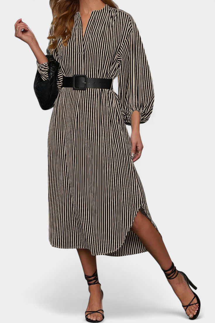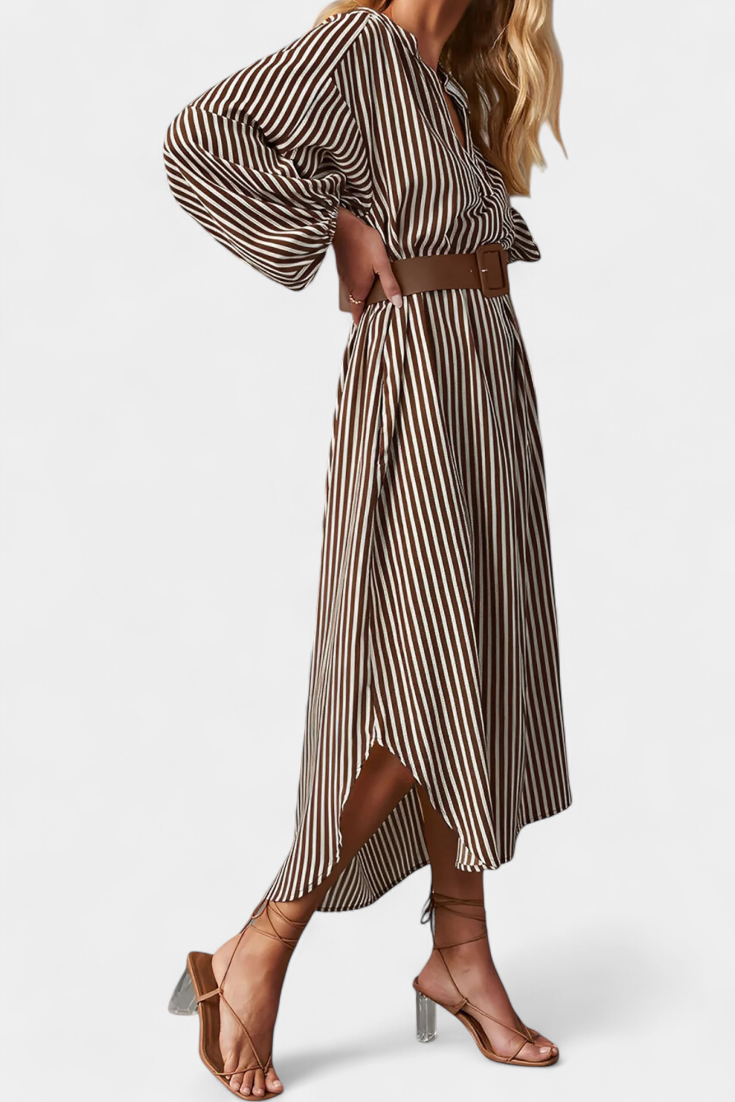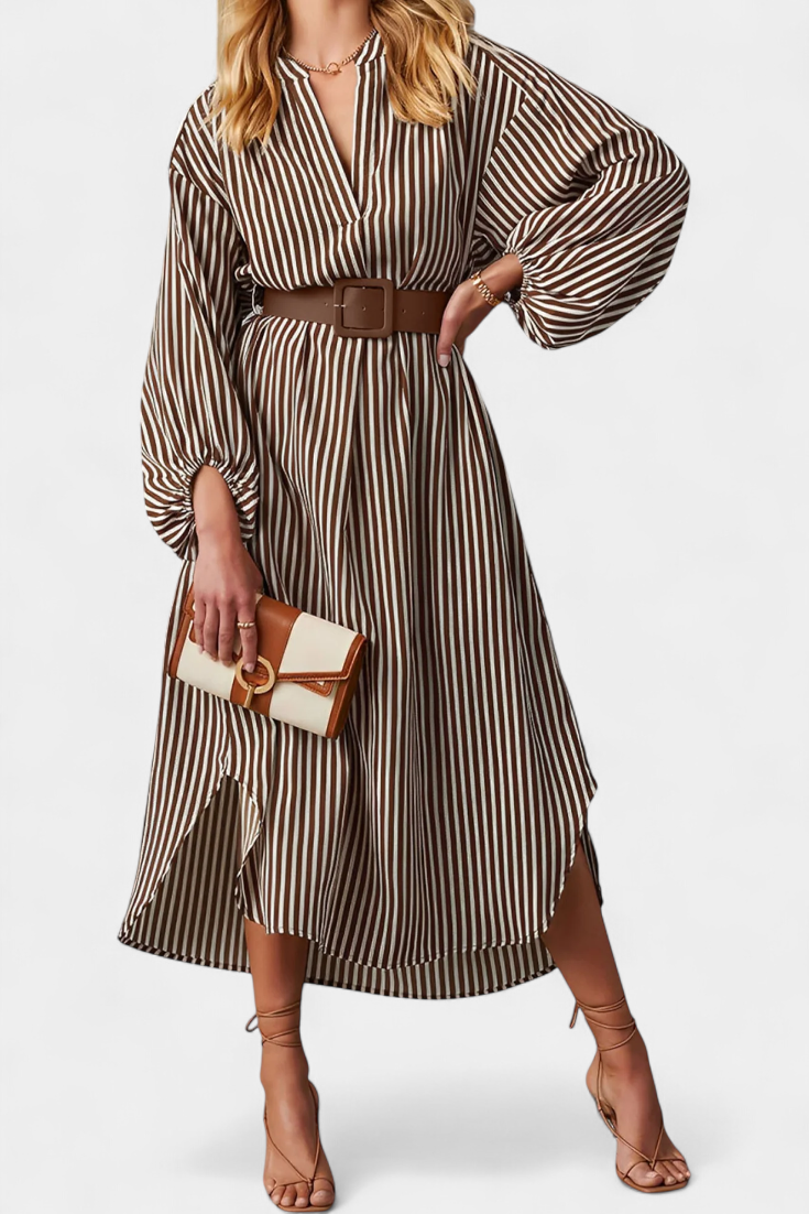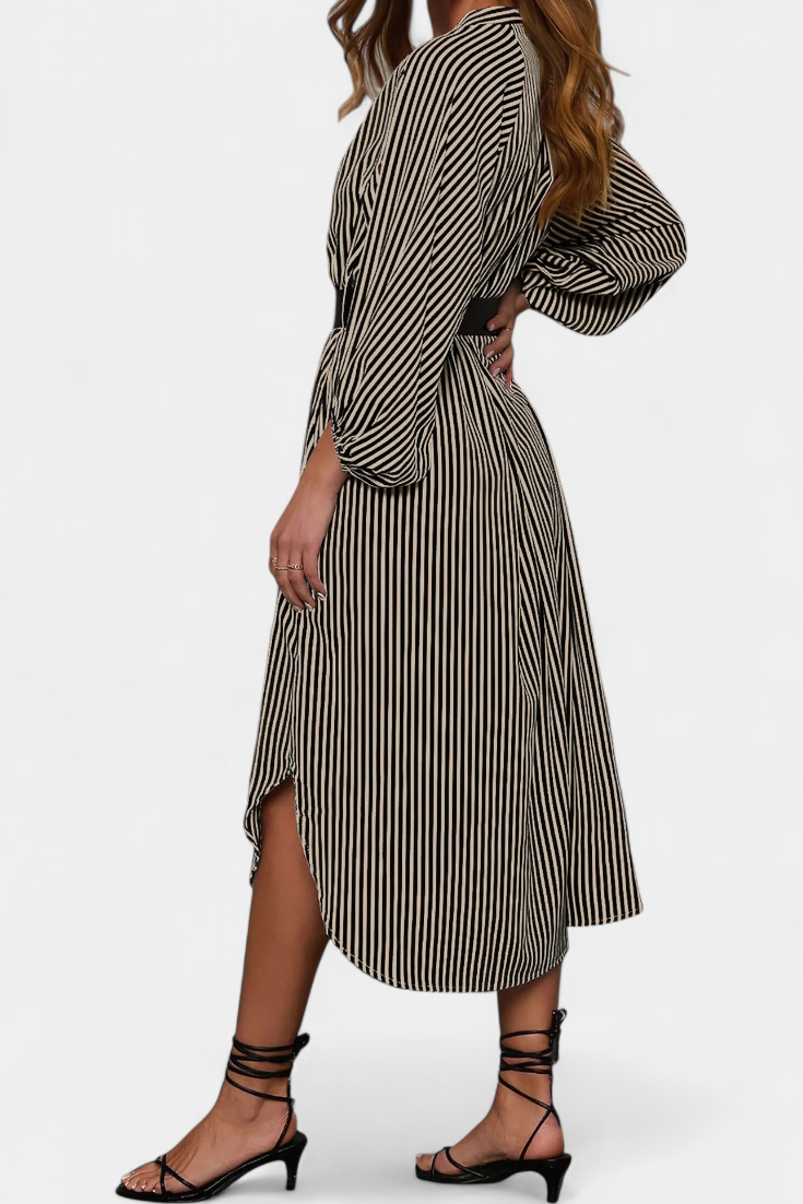Une proposition moderne qui allie fonctionnalité et style raffiné. Eliana se distingue par un motif de rayures verticales qui affine la silhouette, un col en V qui apporte du caractère et des manches longues qui équilibrent le design. La ceinture ajustable définit la taille, tandis que les poches ajoutent une touche pratique et contemporaine.