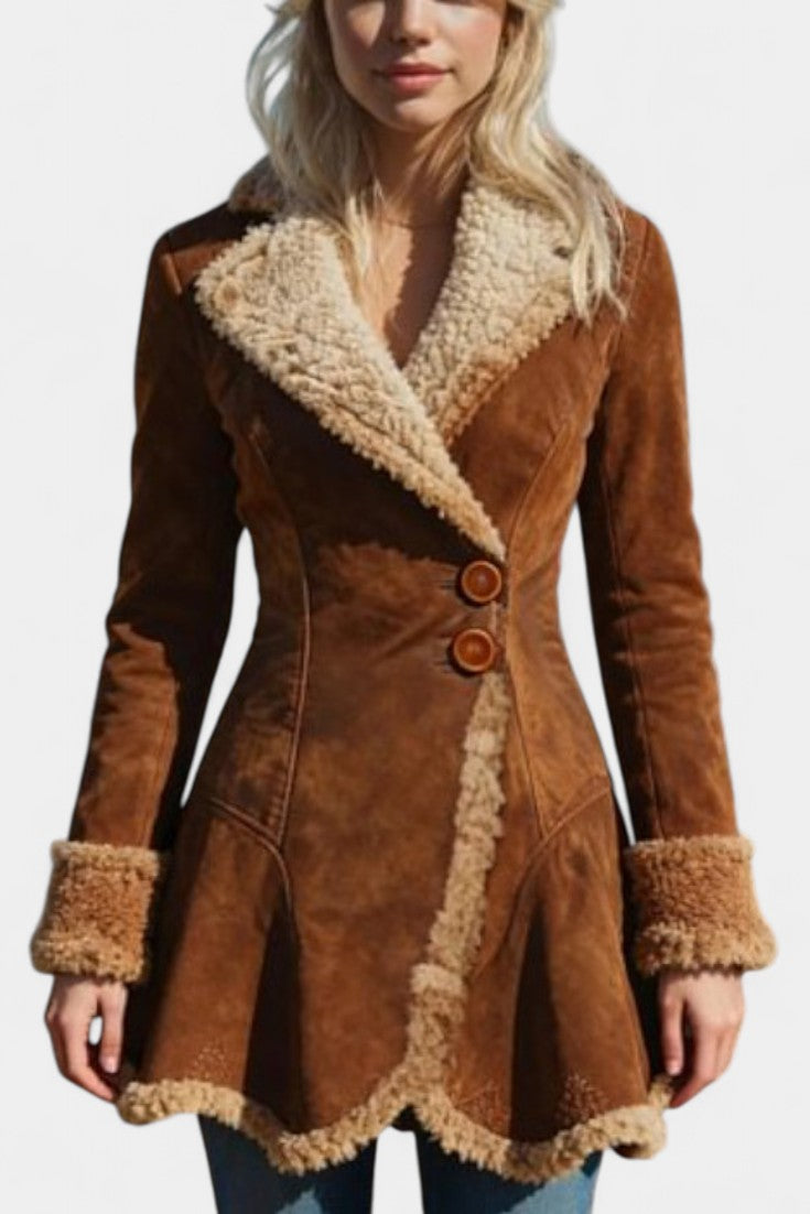 Sandra Manteau Long en Suède à Double Boutonnage et Garniture Noire