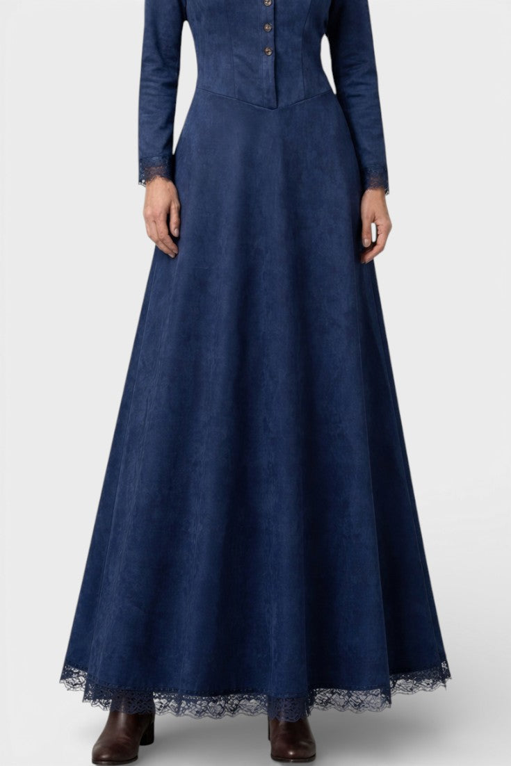 Marie Robe Longue en Suédine avec Col Chemise et Dentelle