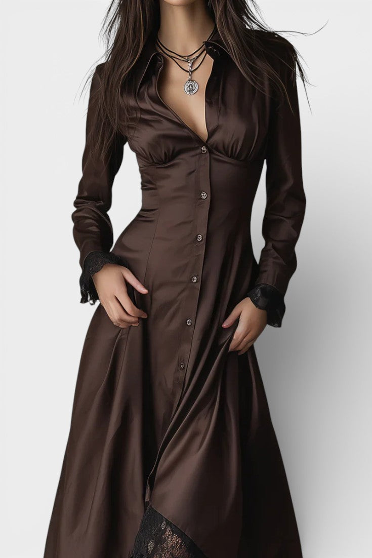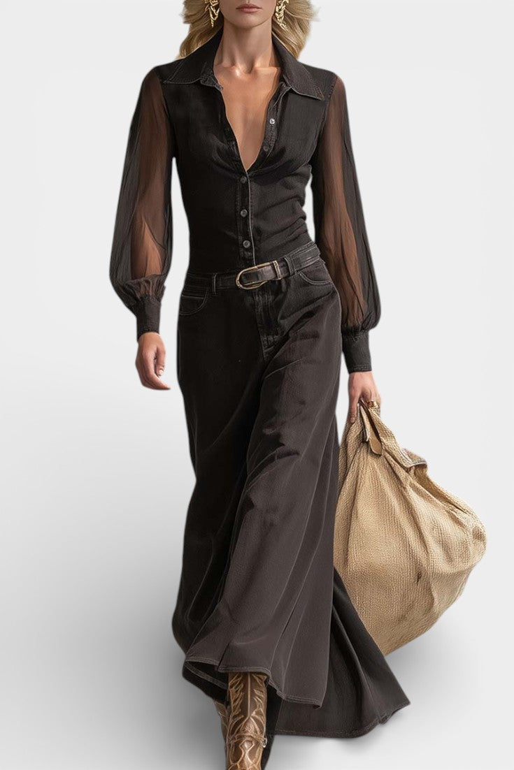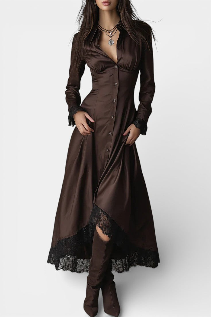 Maravilla Robe Longue en Suédine avec Col Chemise et Dentelle