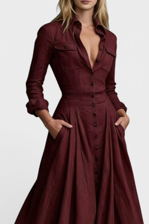 Une robe qui impose une élégance naturelle et une allure affirmée. Gabriela séduit par sa coupe chemise structurée, son boutonnage délicat et sa jupe ample qui accompagne chaque mouvement avec grâce. La taille marquée sculpte la silhouette, tandis que les manches longues et le col classique apportent une sophistication intemporelle. Une pièce forte, pensée pour celles qui aiment conjuguer féminité et caractère.