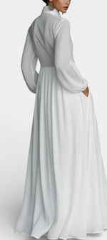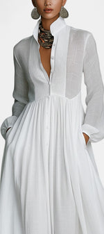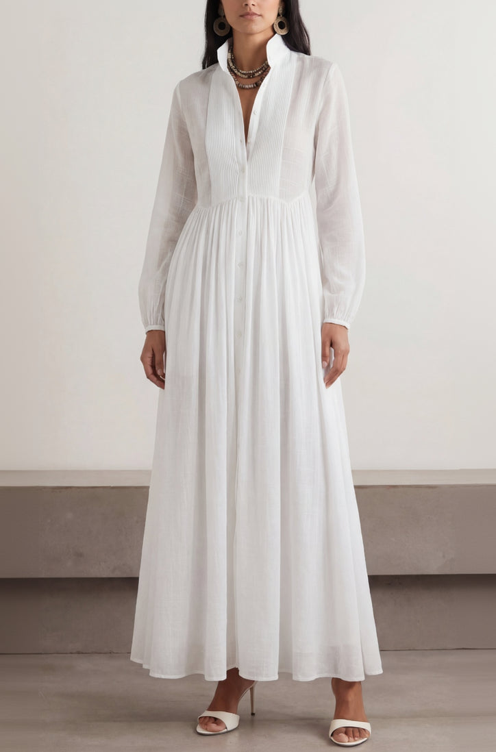 Une pièce longue et épurée qui mise sur la simplicité raffinée. Marilou se distingue par son col montant gracieux, son jeu de patchwork subtil et son devant à boutonnage simple qui structure la silhouette avec délicatesse. Confectionnée en coton flammé, sa coupe fluide et régulière crée une allure naturelle, minimaliste et élégante.