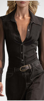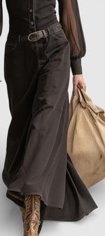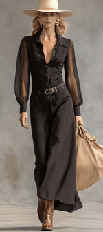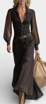 Une robe au caractère fort, qui revisite l’esthétique western avec une élégance contemporaine. Placidia se distingue par son denim noir profond, son boutonnage frontal vintage et son décolleté en V qui allonge la silhouette avec subtilité. Les manches longues légèrement transparentes apportent une touche de contraste raffinée, tandis que la coupe ajustée, accompagnée de sa ceinture, structure le corps avec précision. Une pièce affirmée, à la fois audacieuse et intemporelle.