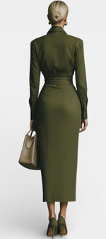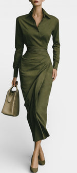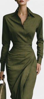 Une robe à l’élégance maîtrisée, pensée pour une allure affirmée et contemporaine. Séraphine se distingue par sa teinte vert armée profonde, sa coupe ajustée et son drapé subtil qui structure la silhouette avec précision. Le col chemise et les manches longues apportent une touche nette et sophistiquée, tandis que le design épuré laisse toute la place à la ligne et au tombé impeccable.
