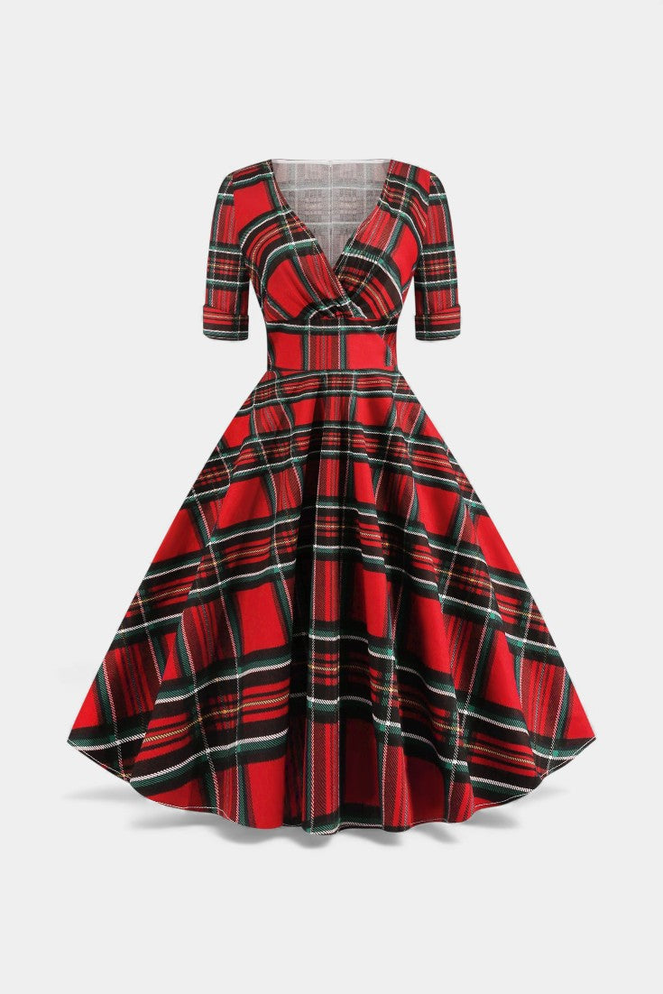 Véra Robe Midi Évasée à Imprimé Plaid et Décolleté V Festif