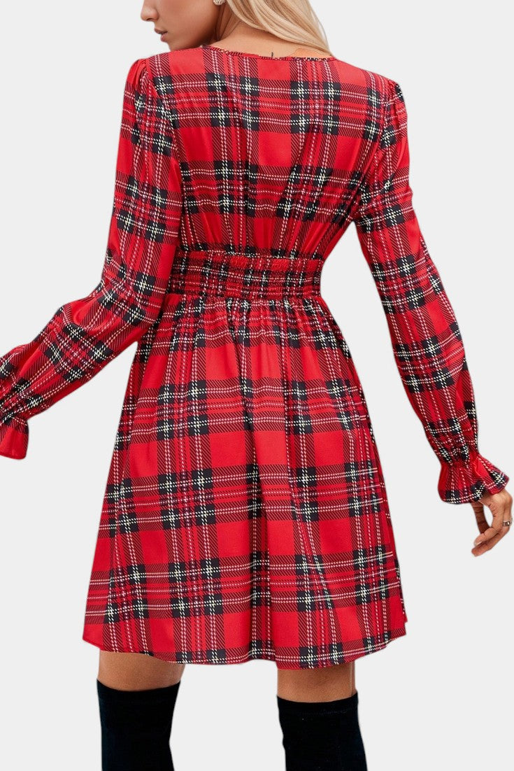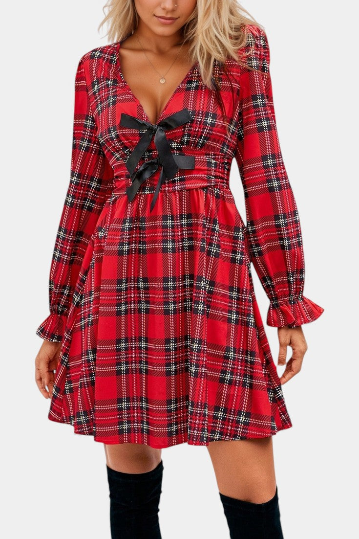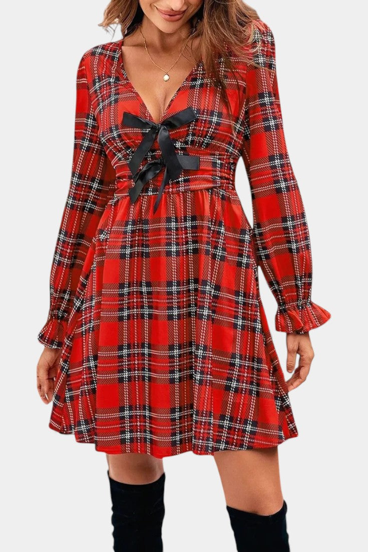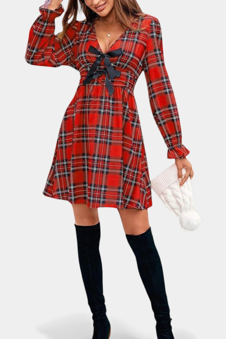 Suzel Robe Mini Évasée à Nœud Plaid et Décolleté V Festif
