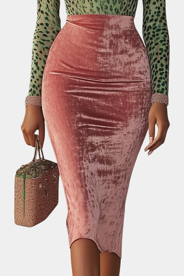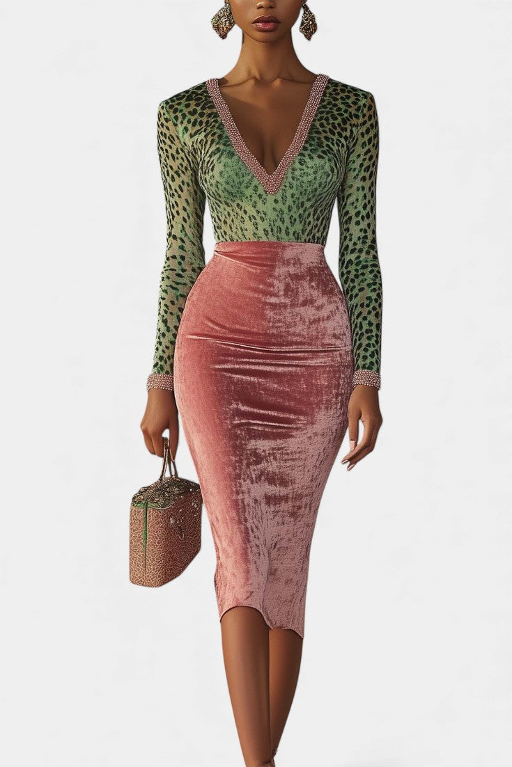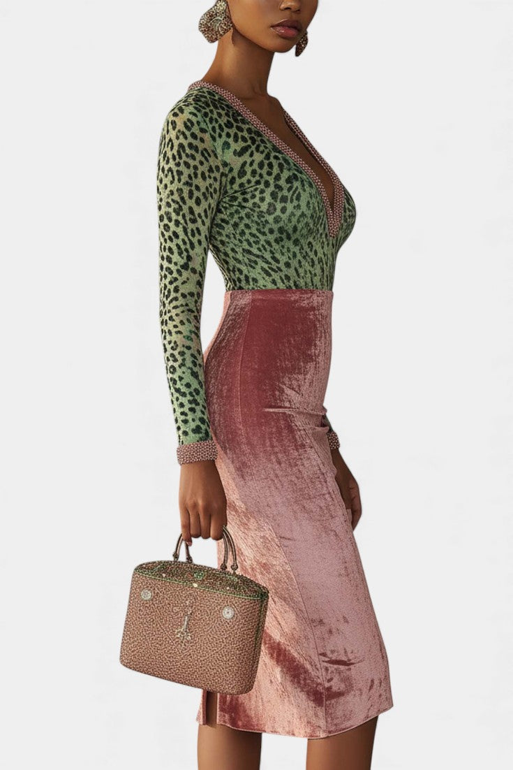 Bernarda Robe Midi Bodycon en Velours Rose et Vert avec Motif Léopard