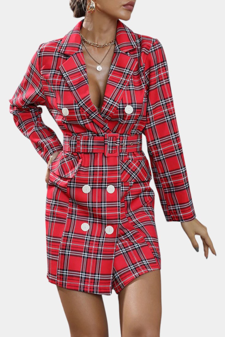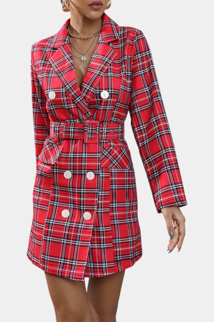 Maddy Robe Tailleur à Carreaux Pied-de-Poule avec Revers et Ceinture