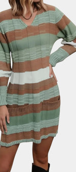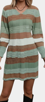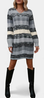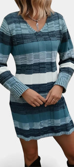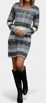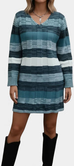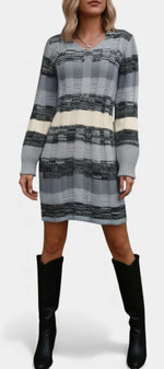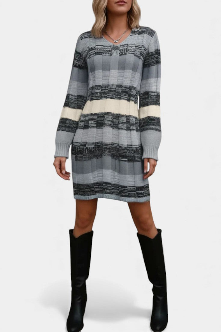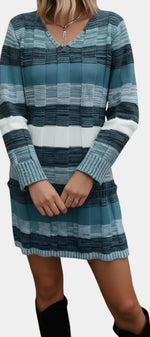 Une robe pensée pour allier confort et style graphique. Lilas séduit par son col en V flatteur, ses rayures contrastées au jeu de couleurs moderne et sa maille douce qui enveloppe la silhouette avec naturel. Les poches intégrées ajoutent une touche pratique et décontractée, faisant de cette robe pull une pièce facile à porter au quotidien tout en restant élégante.