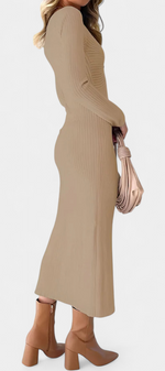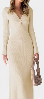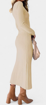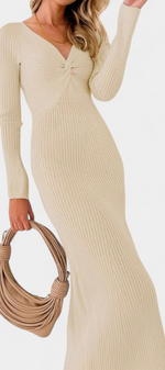 Cliente Mahaute Paris portant une robe en maille beige chez elle