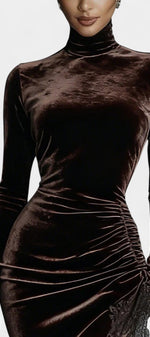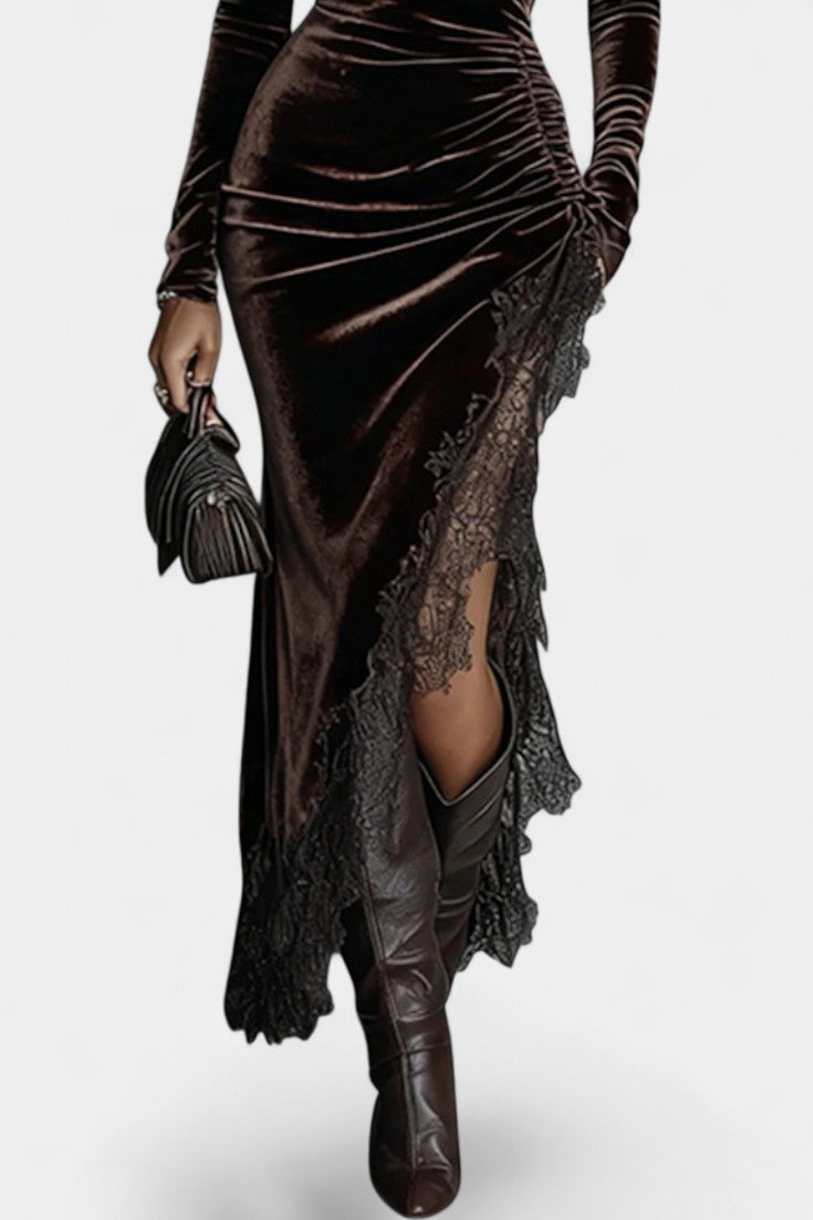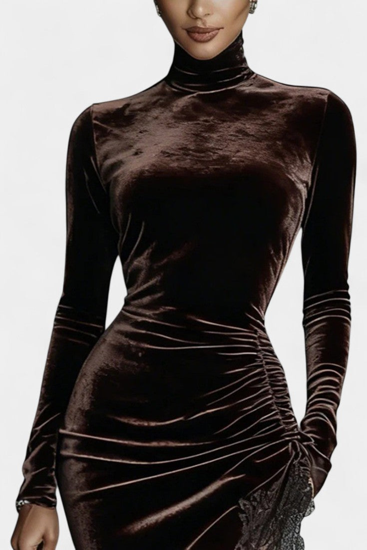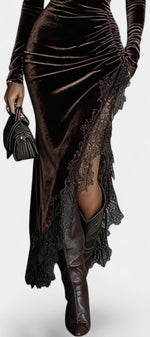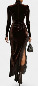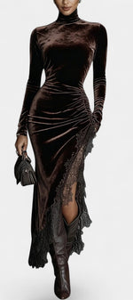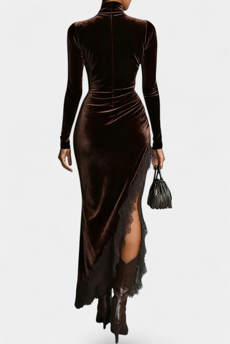 Une robe qui capture la lumière et sublime la silhouette avec une intensité raffinée. Mylène associe un velours chocolat brillant à une coupe ajustée qui épouse le corps avec élégance. Son col haut et ses manches longues équilibrent parfaitement la sensualité du tissu, tandis que l’ourlet irrégulier dévoile une dentelle délicate pour une touche dramatique et romantique.