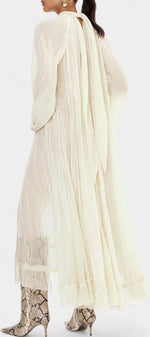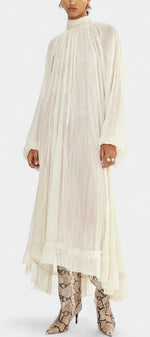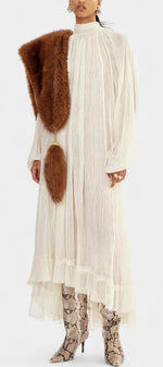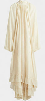 Prunelle évoque une élégance naturelle et aérienne. Confectionnée dans un tissu texturé délicat, elle joue sur la fluidité et la légèreté tout en conservant une allure raffinée. Son col montant froncé et ses manches amples apportent une touche bohème chic, tandis que sa silhouette longue et vaporeuse sublime chaque mouvement avec grâce.