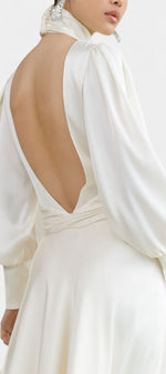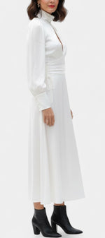 Une robe d’une élégance aérienne, pensée pour sublimer la silhouette avec douceur et sophistication. Abundia séduit par son col montant drapé, sa découpe frontale subtilement sensuelle et sa taille froncée qui structure la ligne avec finesse. Son tissu satiné fluide capte la lumière avec délicatesse, tandis que la jupe longue et évasée accompagne chaque mouvement avec grâce. Une pièce raffinée qui conjugue féminité moderne et allure intemporelle.
