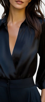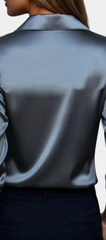 Associez-la à un pantalon tailleur noir pour un contraste chic, ou glissez-la dans une jupe midi pour une allure féminine et contemporaine. Ajoutez des accessoires argentés ou des boucles d’oreilles statement pour magnifier l’éclat du satin et créer une tenue sophistiquée en un instant.