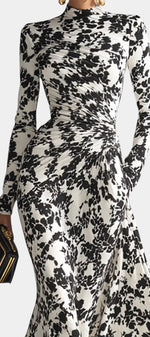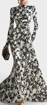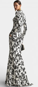 Une allure sophistiquée qui conjugue féminité et élégance graphique. Amada séduit par son imprimé floral noir et blanc au contraste affirmé, son col montant raffiné et sa coupe portefeuille qui structure délicatement la silhouette. Le buste ajusté met en valeur la taille tandis que la jupe longue et fluide accompagne le mouvement avec grâce. Une pièce distinguée, idéale pour celles qui recherchent une élégance intemporelle et affirmée.