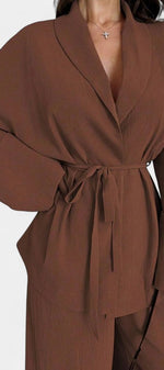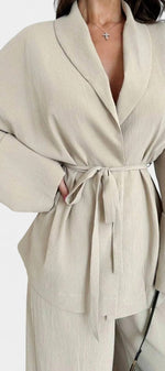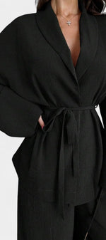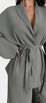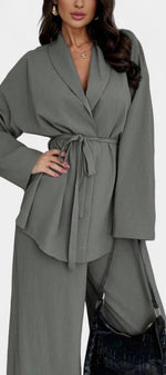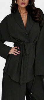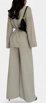 Amy revisite l’élégance rétro avec une touche contemporaine. Confectionné en polyester doux, cet ensemble deux pièces associe un blazer à décolleté en V plongeant et un pantalon à jambes larges, offrant une silhouette fluide et sophistiquée. Sa coupe ample et son design minimaliste traduisent un style à la fois moderne et intemporel, parfait pour affirmer son allure avec confiance et féminité.