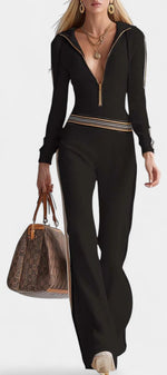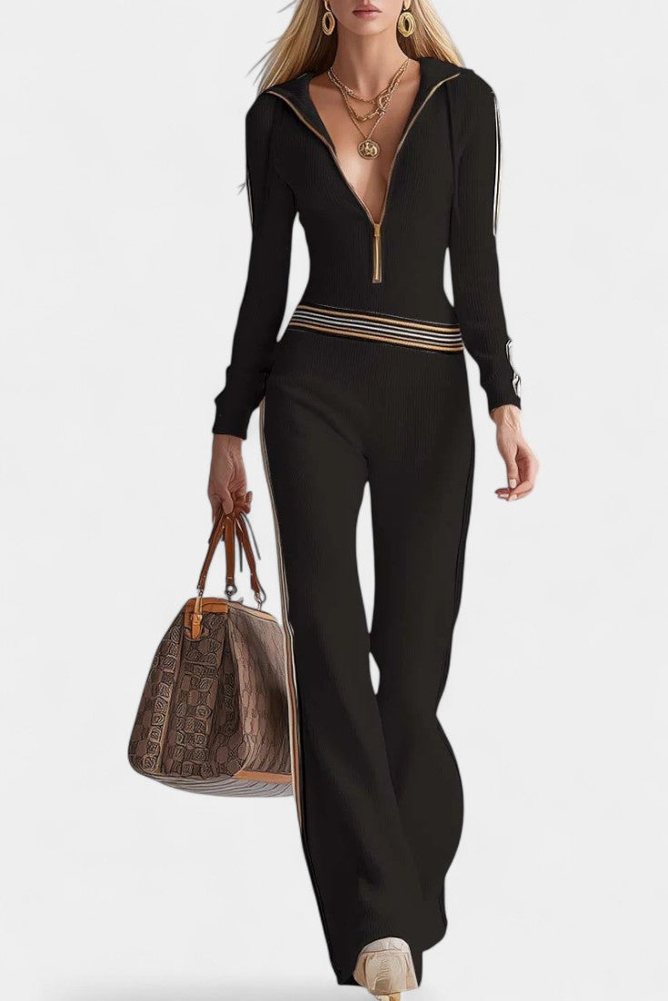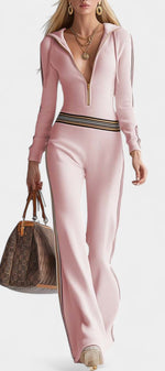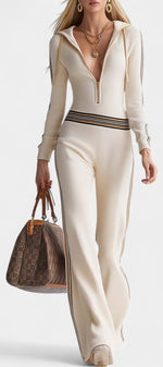 Angélise revisite l’esprit rétro avec une touche sportive et moderne. Confectionnée en maille douce et respirante, cette combinaison à capuche séduit par son col en V zippé et ses rayures contrastées à la taille et aux poignets. Sa coupe ajustée sublime la silhouette tout en offrant une liberté de mouvement et un confort optimal, idéale pour un style chic et décontracté.
