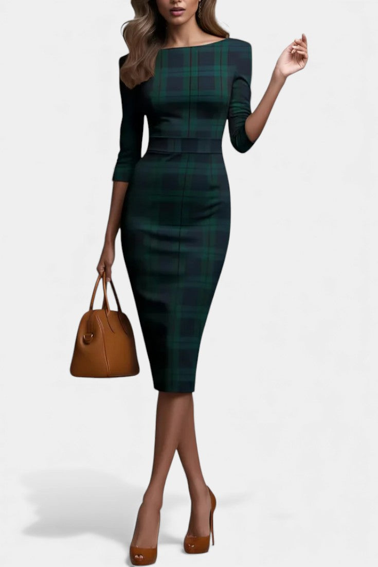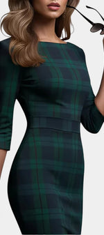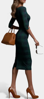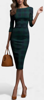 Axelle Robe Midi à Carreaux avec Manches Trois-Quarts