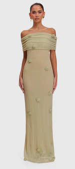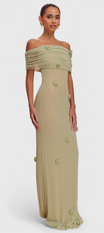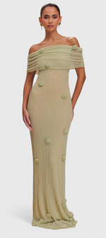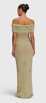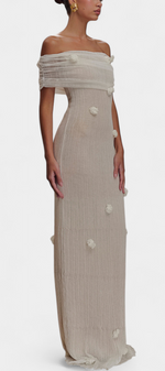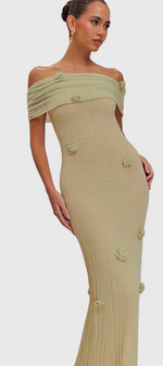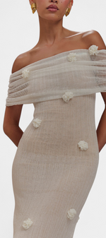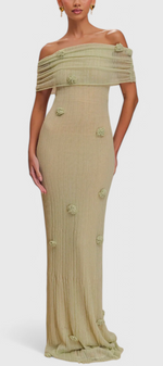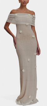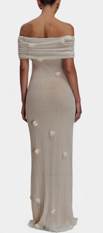 Élégante, romantique et modernement sans effort—cette robe en tricot off-shoulder est conçue pour mettre en valeur et séduire. Avec des détails d'orchidées en 3D sculptées et une silhouette de queue de poisson élégante, c'est la pièce parfaite pour attirer les regards lors de fêtes dans le jardin, d'escapades au bord de la mer ou d'événements estivaux élégants.
