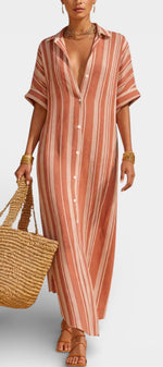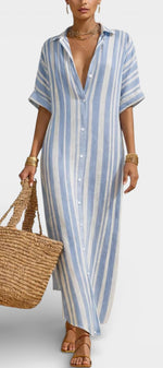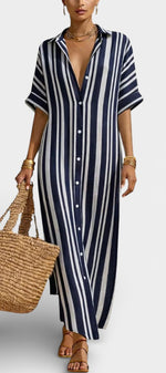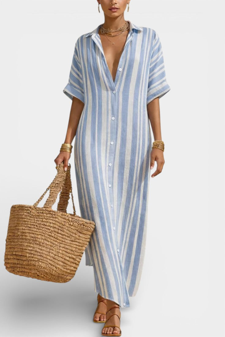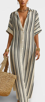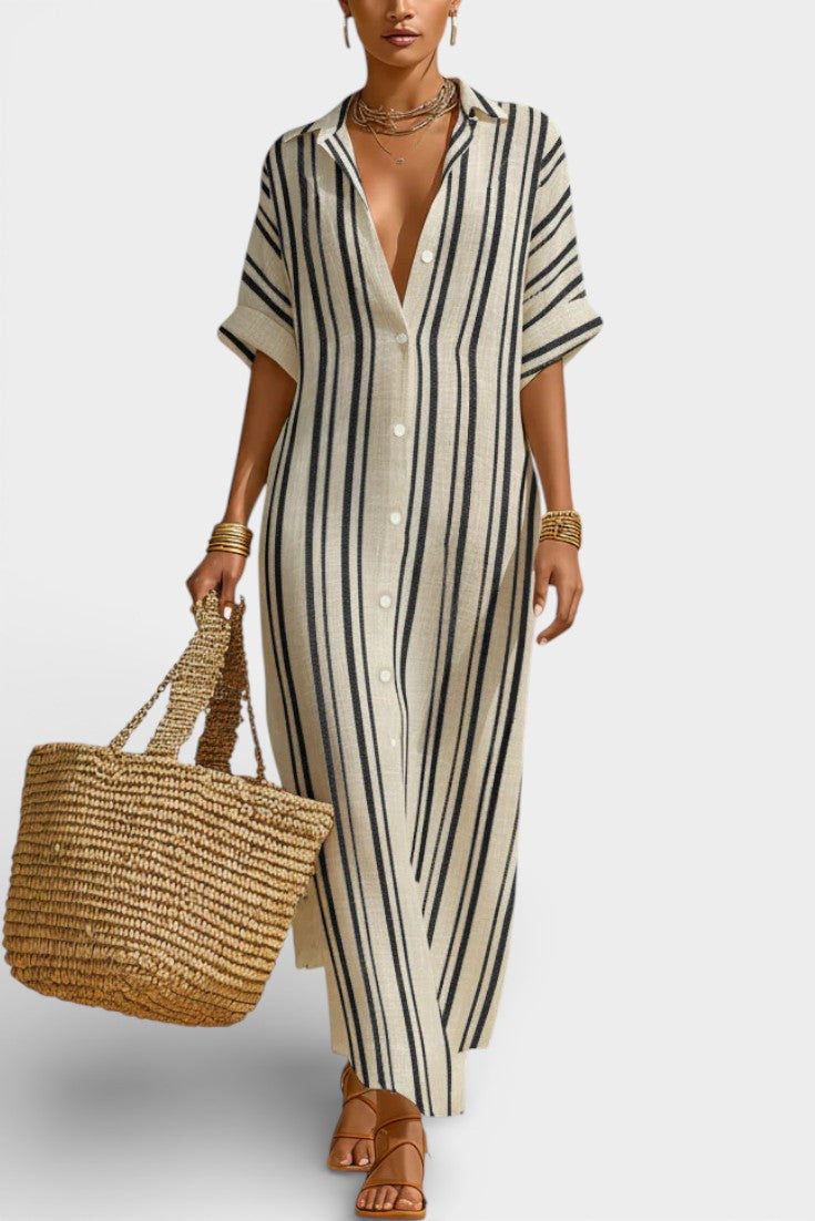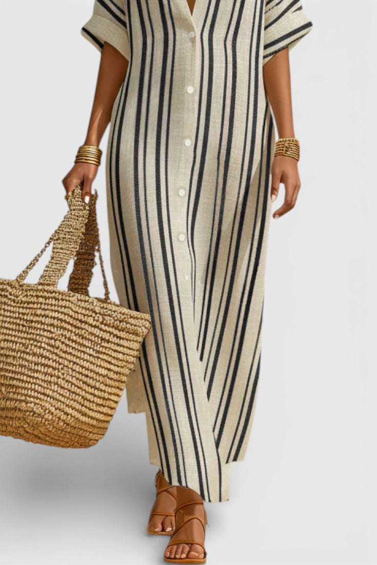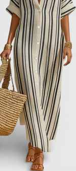 Naturelle et assurée, la robe Carter incarne une élégance estivale sans contrainte. Sa coupe longue et droite, inspirée de la chemise, est sublimée par des rayures verticales qui allongent la silhouette avec justesse. Confectionnée dans un lin mélangé léger et respirant, elle offre une sensation de fraîcheur idéale pour les journées ensoleillées, tout en conservant une allure soignée et contemporaine. Le boutonnage discret et les manches courtes renforcent son esprit épuré et intemporel.