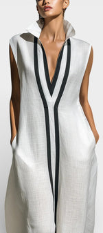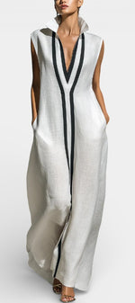 Graphique et résolument contemporaine, la combinaison Cherise séduit par son minimalisme structuré et son contraste noir délicat qui souligne les lignes avec précision. Confectionnée en lin respirant, elle présente un décolleté en V épuré et une coupe droite à pantalon large qui allonge la silhouette avec élégance. Son design sans manches apporte légèreté et modernité, faisant de cette pièce un essentiel chic pour les saisons lumineuses.