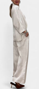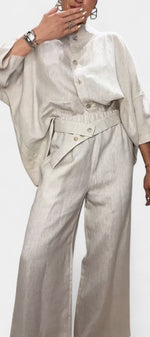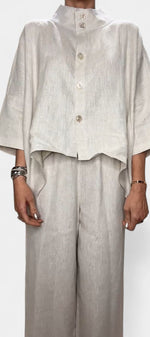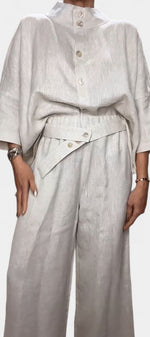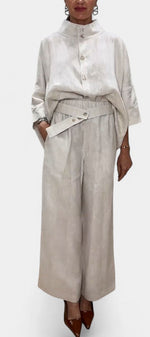Minimalisme élevé avec une touche moderne. L'ensemble Ailany présente un haut structuré à col haut avec des boutons sur le devant et des manches larges à coupe droite, offrant un look soigné sans effort. Les pantalons à jambes larges avec une taille asymétrique et un détail de bouton créent une silhouette élégante et contemporaine, parfaite pour ceux qui recherchent une sophistication décontractée.