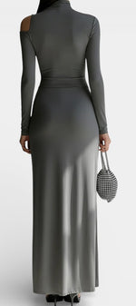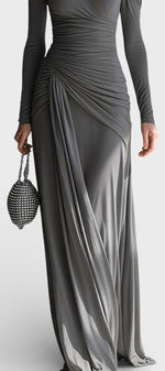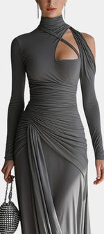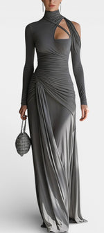 Une robe au charme magnétique, pensée pour sublimer la silhouette avec élégance et assurance. Florinda séduit par sa teinte grise au fini lumineux, travaillée avec des fronces délicates et des découpes subtiles qui structurent le corps avec précision. Sa coupe ajustée met en valeur les lignes naturelles, tandis que le col haut et la longueur longue apportent une sophistication affirmée. Une pièce d’exception, idéale pour les moments où l’élégance doit se faire remarquer sans excès.