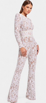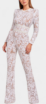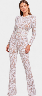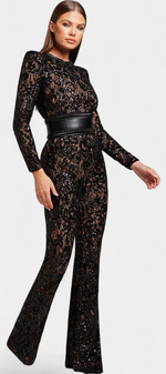 Audacieuse et sophistiquée, la combinaison Jimena associe la délicatesse de la dentelle brodée de paillettes à une silhouette structurée qui capte la lumière à chaque mouvement. Sa base translucide crée un contraste sensuel et moderne, tandis que la ceinture corset souligne la taille avec caractère. La coupe droite du pantalon allonge élégamment la ligne, offrant une présence glamour et affirmée.