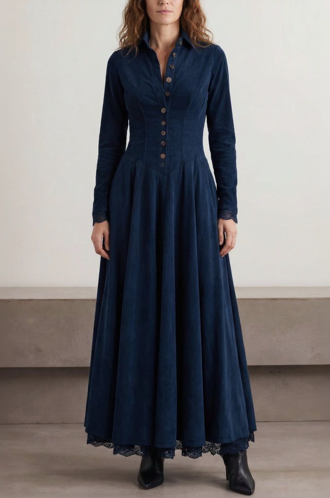 Une robe longue au charme mystérieux, mêlant élégance affirmée et esprit gothique subtil. Maravilla associe une coupe ajustée à un col chemise structuré, tandis que la dentelle apporte une touche délicate qui adoucit l’ensemble. Sa longueur maxi crée une silhouette élancée et harmonieuse, idéale pour des instants où l’on veut paraître à la fois moderne et sophistiquée.