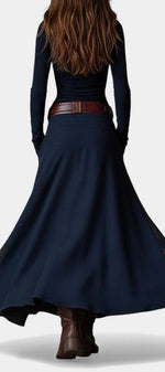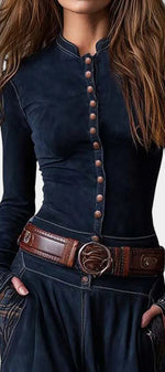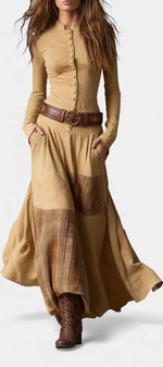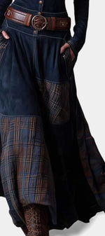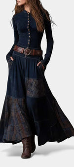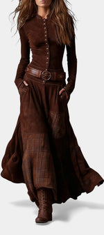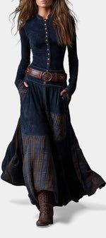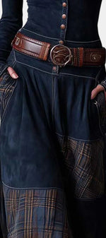 Intemporelle et pleine de caractère, la robe Marlis associe la richesse du suède écologique à l’authenticité d’un patchwork à carreaux pour une allure résolument vintage. Son corsage ajusté, souligné par un col montant et des boutons métalliques, structure la silhouette avec finesse, tandis que la jupe fluide à panneaux crée un mouvement ample et gracieux à chaque pas. L’harmonie entre les tons marine profonds et les nuances brun-bleu offre un charme retro Western revisité avec sophistication.  (sans ceinture)