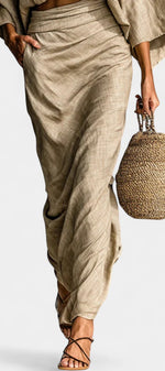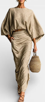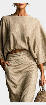 À la fois fluide et naturellement élégant, l’ensemble Marva séduit par son équilibre parfait entre confort et allure raffinée. Le haut à manches chauve-souris offre une coupe ample et aérienne qui apporte liberté de mouvement et modernité, tandis que la jupe longue assortie accompagne la silhouette avec une fluidité gracieuse. L’ensemble crée une ligne harmonieuse, idéale pour un style sans effort, chic et décontracté à la fois.