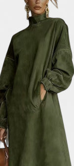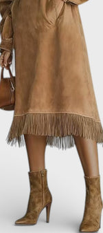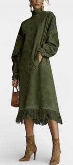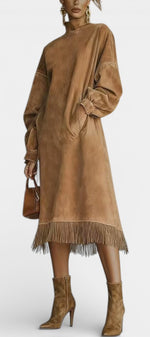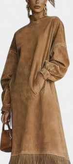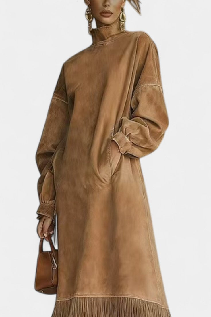 Une robe au caractère affirmé qui mêle esprit bohème chic et modernité assumée. Monique séduit par sa coupe midi droite et fluide, sublimée par un effet suédé doux au toucher et une finition frangée délicate à l’ourlet. Son col montant et ses manches longues légèrement amples apportent une élégance naturelle, tandis que la silhouette épurée crée une allure contemporaine et confiante. Une pièce forte, pensée pour celles qui aiment se distinguer avec subtilité.
