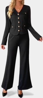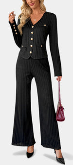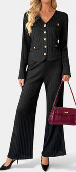 Un ensemble épuré pensé pour une élégance naturelle et contemporaine. Nahia associe un haut en maille aux lignes sobres à un pantalon large fluide, créant une silhouette équilibrée et moderne. Sa coupe minimaliste met l’accent sur le confort et la liberté de mouvement, tout en conservant une allure soignée et raffinée.