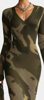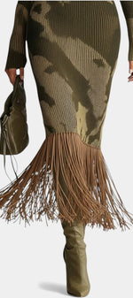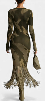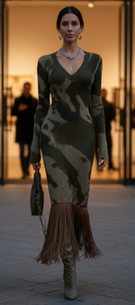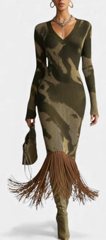 Neele Robe Midi Texturée Camouflage Olive à Franges & Col V