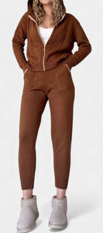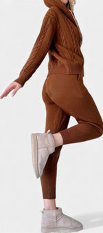 Chaleureux, texturé et subtilement sophistiqué, l’ensemble Perdita réunit un cardigan et un pull assortis en jacquard torsadé pour un look résolument cosy-chic. Sa maille épaisse au motif sculpté apporte du relief, tandis que sa coupe décontractée en fait un incontournable pour les journées fraîches où confort et style sont essentiels. Une tenue parfaite pour se sentir élégante sans effort, du quotidien aux moments détente.