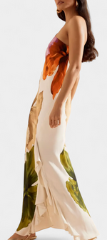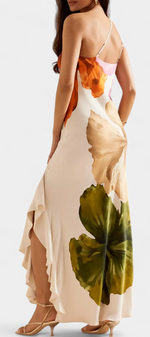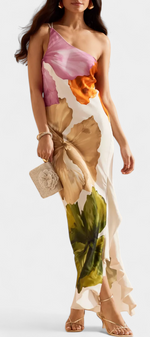 Almudena Robe Maxi Patchwork à Taille Empire et Col Asymétrique