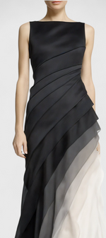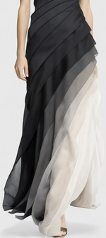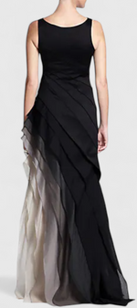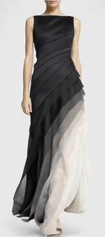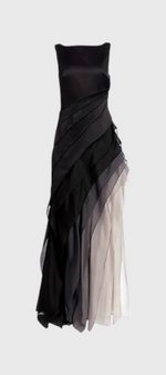 Légèreté sophistiquée avec un jeu de tons qui attire tous les regards. La robe Angela combine un élégant décolleté bardot sans manches avec des couches de chiffon qui fluidifient le mouvement. Son dégradé du noir à l'ivoire apporte une profondeur visuelle et une présence raffinée pour des occasions spéciales.
