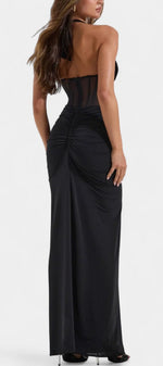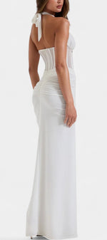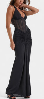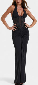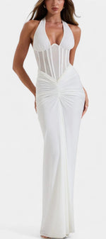 Un ensemble de deux pièces conçu pour sculpter la silhouette avec une sophistication raffinée. Angelina combine un corset en maille structuré avec des baleines et un décolleté halter profond ajustable, offrant soutien et définition. La jupe maxi froncée tombe élégamment jusqu'au sol, créant un mouvement fluide qui équilibre sensualité et luxe moderne.