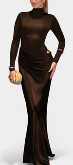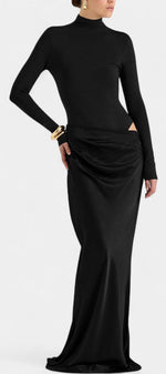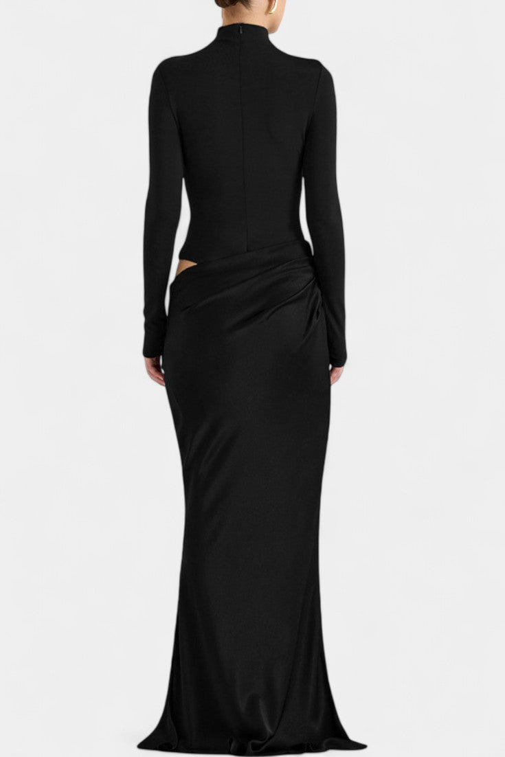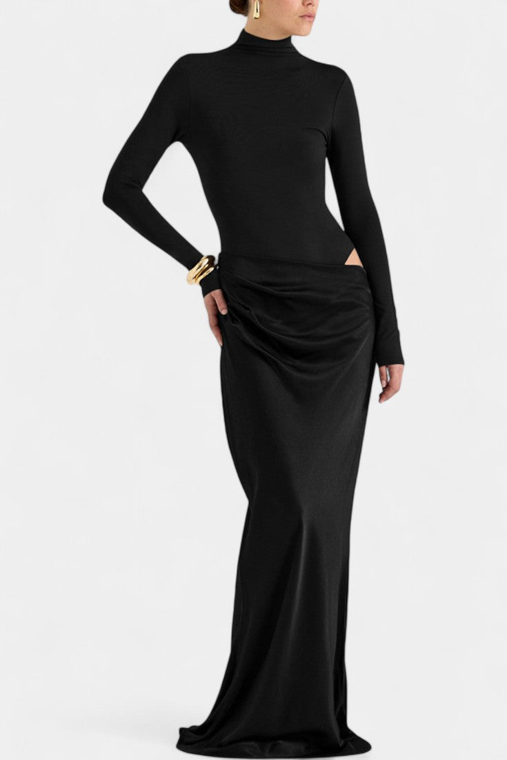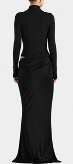 Minimaliste et avant-gardiste, la robe Tierra redéfinit l'élégance moderne avec un design à manches longues ajustées et un détail découpé sophistiqué au niveau des hanches. Sa jupe longue avec drapé apporte mouvement et structure, créant une silhouette à la fois puissante et féminine.