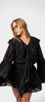 Alida Robe à Pois avec Décolleté à Volants et Manches Évasées