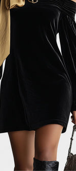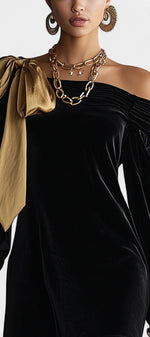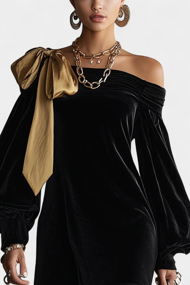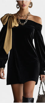 Emani Robe Mini Off-Shoulder en Velours Noir et Nœud Doré