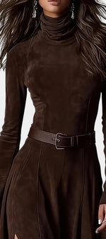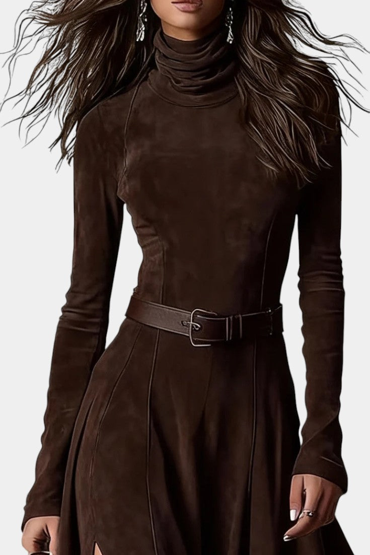 Sculpturale et moderne, la robe Roselda joue sur la sensualité discrète du faux suède et la sophistication d’une coupe ajustée. Son col roulé allonge la ligne du cou, tandis que la fente frontale apporte une allure affirmée sans jamais perdre en élégance. La texture douce et chaude du suède synthétique enveloppe la silhouette avec raffinement, et la ceinture incluse permet de définir la taille selon vos envies. Une pièce forte qui mêle confort, structure et charme contemporain. (sans ceinture)