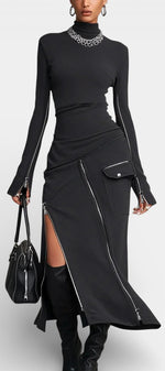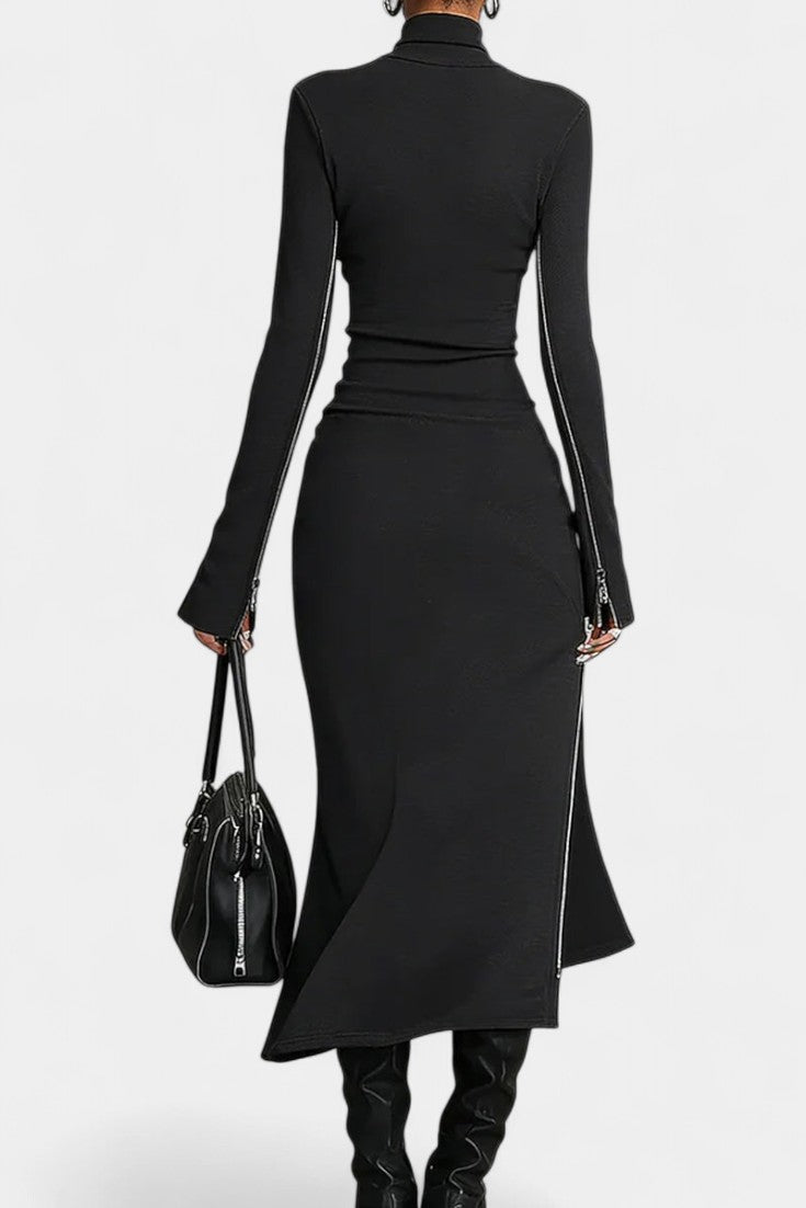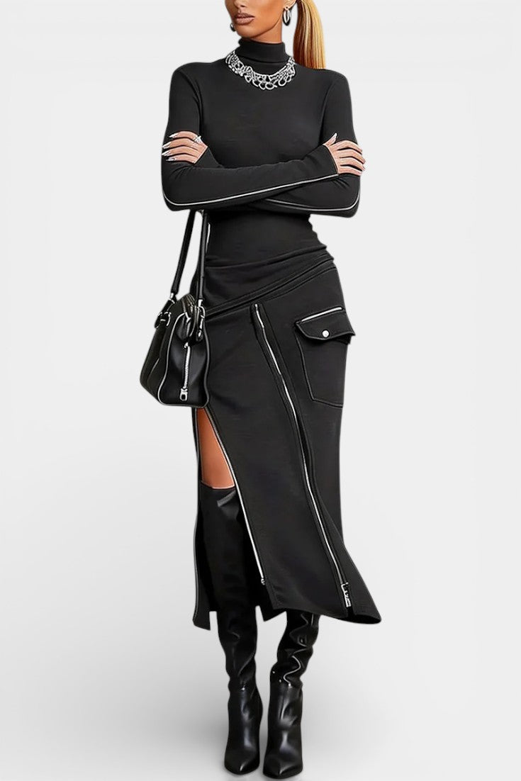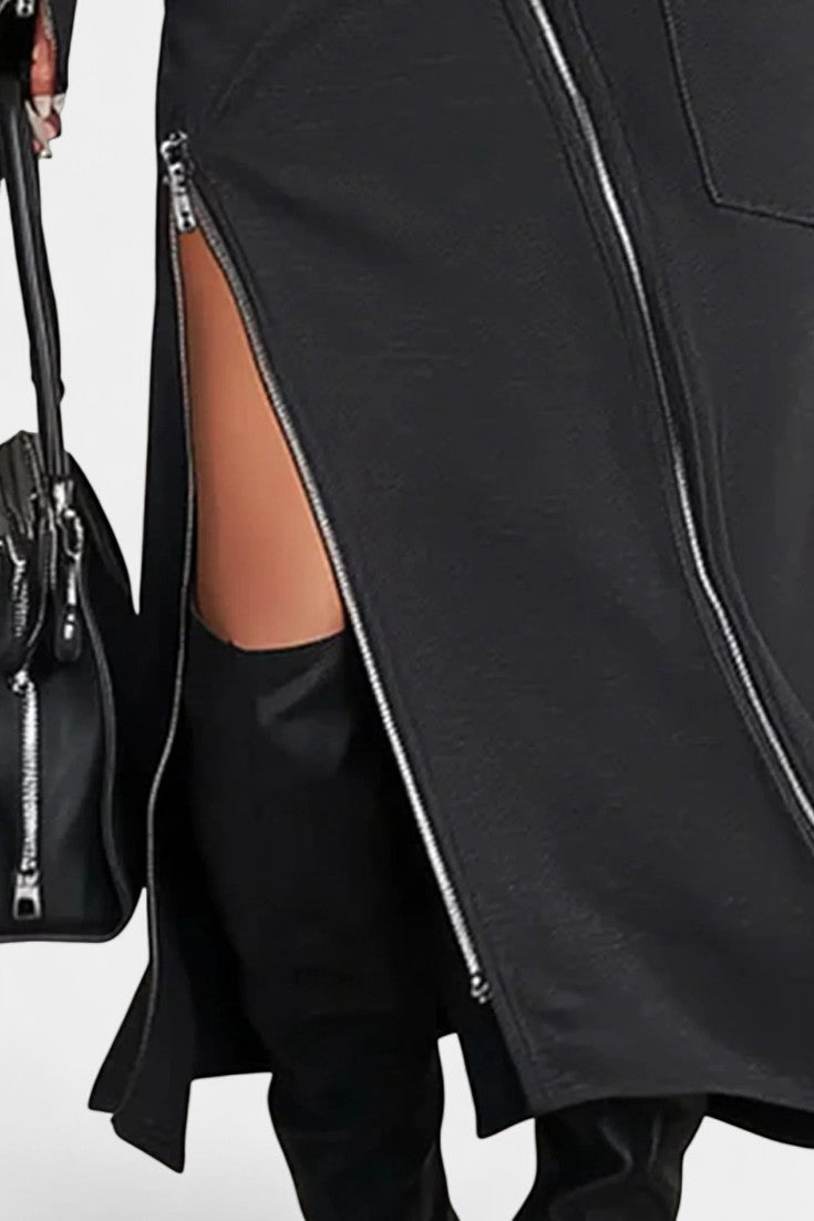Col montant structuré, design asymétrique, multiples fermetures éclair décoratives et fonctionnelles, grandes poches qui soulignent l’esthétique moderne, coupe ajustée flatteuse.